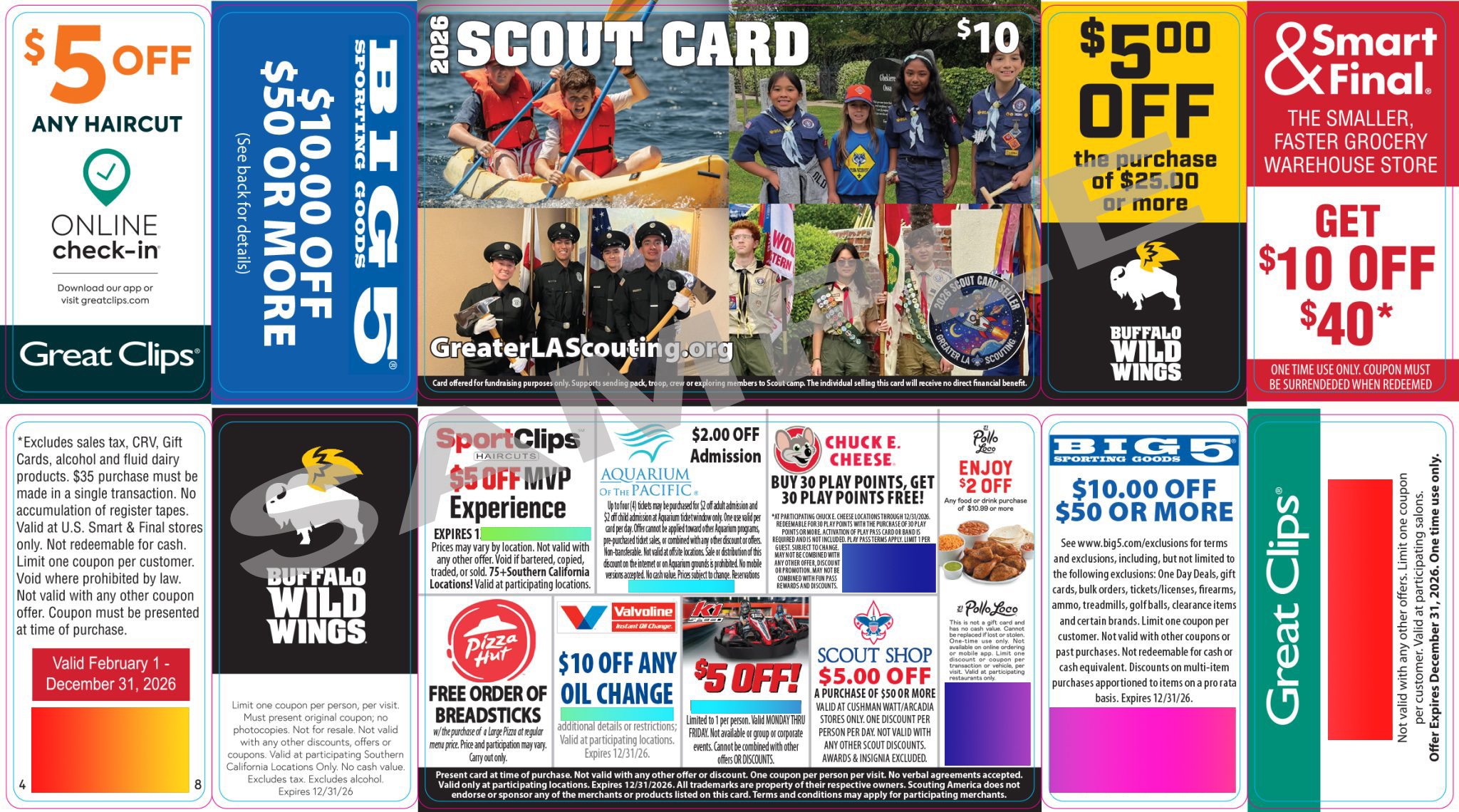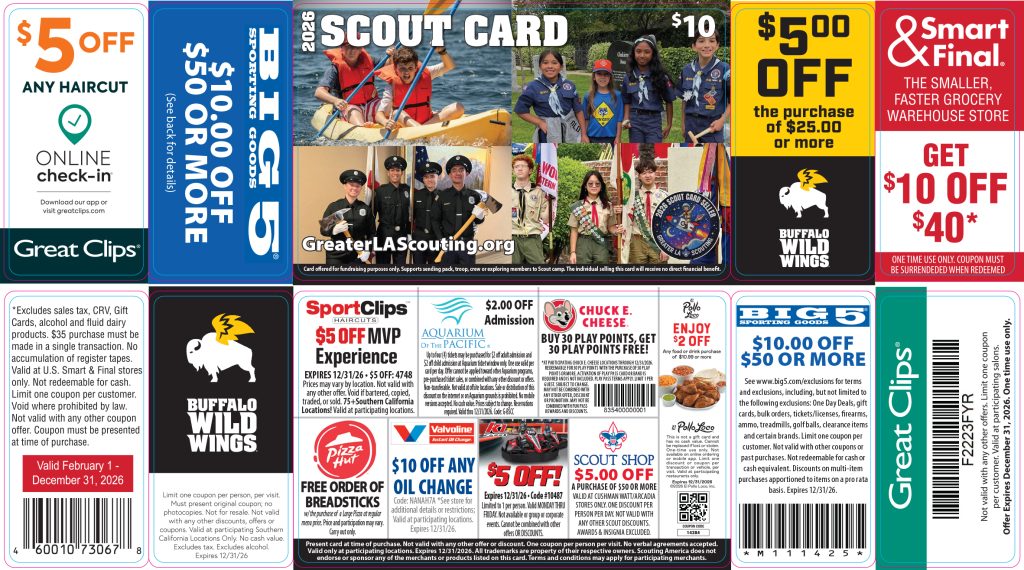Greater Los Angeles Scouting offers an exciting way for Scouts to earn their way to camp through our Scout Card fundraiser. Scout Cards are discount cards packed with local deals and savings at popular businesses. Scouts sell these cards for $10 to raise money for camp fees, registration, or other Scouting activities and keep $5 of each card they sell.